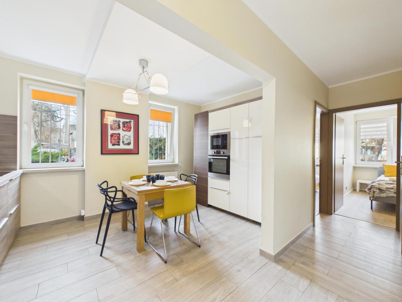 Apartament typu Standard z 2 sypialniami. This spacious apartment comprises 1 living room, 2 separate bedrooms and 1 bathroom with a bath or a shower and a hairdryer. The fully equipped kitchen features a stovetop, a refrigerator, a dishwasher and an oven. The apartment provides a flat-screen TV, a washing machine, a seating area, a dining area as well as garden views. The unit offers 3 beds. Apartament - 6 osobowy. Powierzchnia pokoju ok.: 64 mkw.